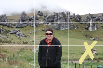This photo is framed much better. You have the subject moved to the side, the camera is in portrait (tall) view and your eyes tend to look at the path that leads up the hill to the rocky outcrop above.